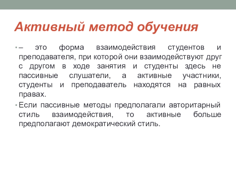 Если пассивные методы предполагали авторитарный стиль взаимодействия, то активные больше предполагают демократический стиль.