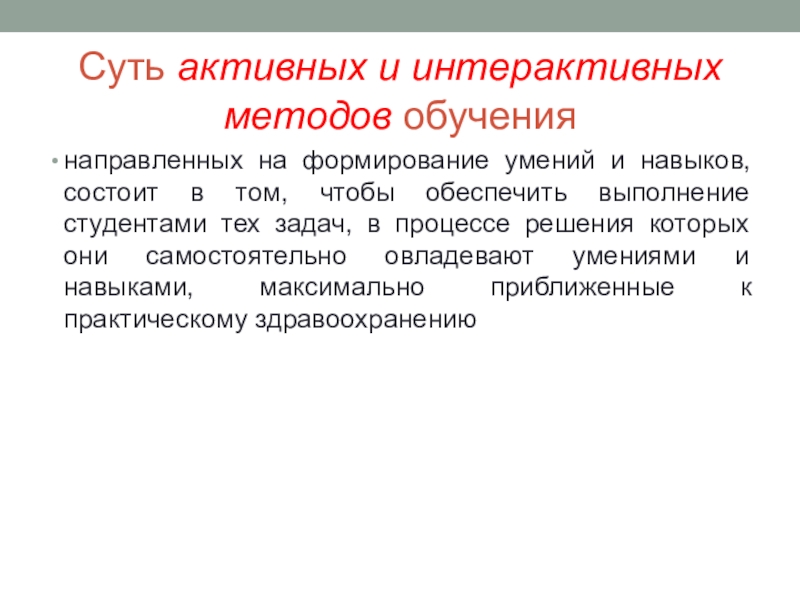 состоит в том, чтобы обеспечить выполнение студентами тех задач, в процессе решения которых они самостоятельно овладевают умениями и навыками, максимально приближенные к практическому здравоохранению