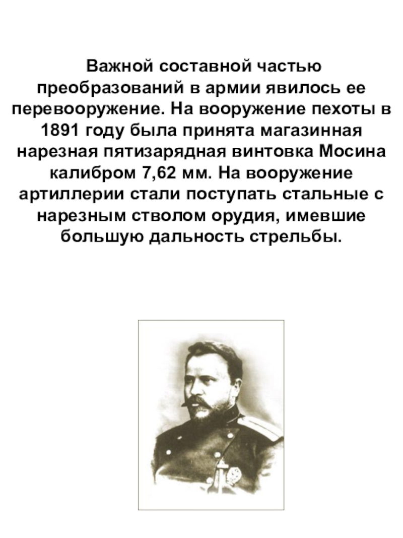 Важной составной частью преобразований в армии явилось ее перевооружение. На вооружение пехоты в 1891 году была