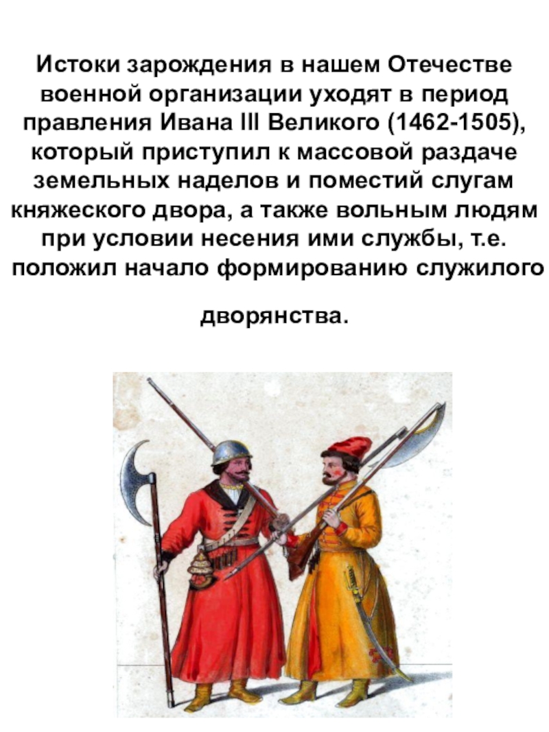 Истоки зарождения в нашем Отечестве военной организации уходят в период правления Ивана III Великого (1462-1505), который приступил к массовой раздаче земельных наделов и поместий слугам княжеского двора, а также вольным людям при условии несения ими службы,