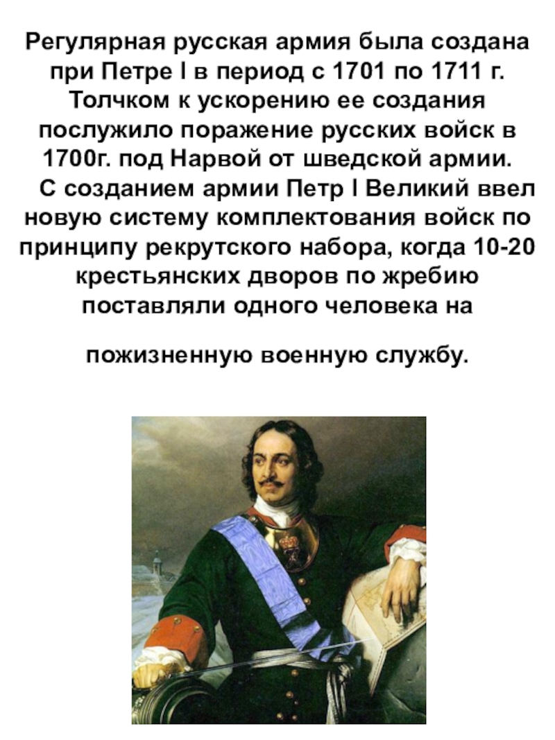 1701 по 1711 г. Толчком к ускорению ее создания послужило поражение русских войск в 1700г. под Нарвой от шведской армии. С созданием армии Петр I Великий ввел новую систему комплектования войск по принципу рекрутского набора, когда 10-20 крестьянских дворов по жребию поставляли одного человека на пожизненную военную службу.