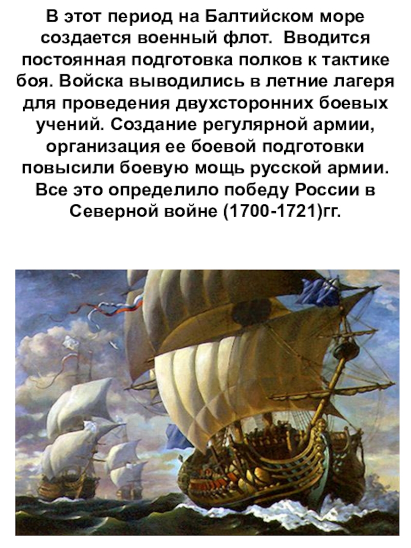 Слайд 4В этот период на Балтийском море создается военный флот. Вводится постоянная