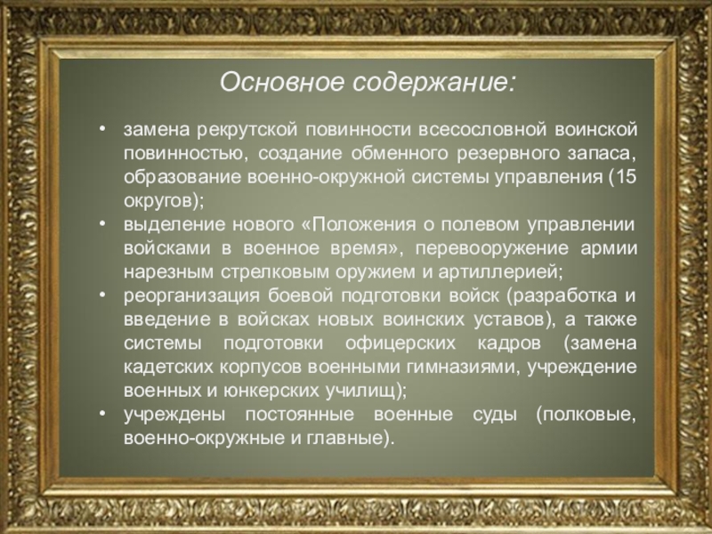 этого времени в России отменили рекрутские наборы в армию и ввели всеобщую воинскую повинность, которая распространилась на мужское население всех классов и сословий, достигшее возраста 21 год. Общий срок службы устанавливался в 15 лет: из них 6 лет приходилось на действительную военную службу, а 9 лет — на пребывание в запасе. Особое внимание уделялось повышению профессиональной подготовки офицерского состава. Была признана необходимой грамотность солдат, поэтому обучение их чтению и письму стало обязательным.
