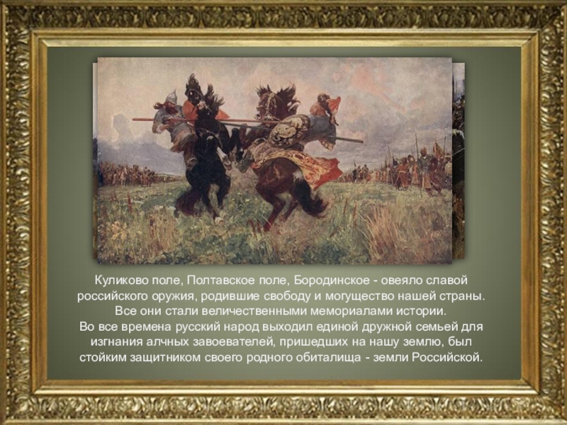 Слайд 6Куликово поле, Полтавское поле, Бородинское - овеяло славой российского оружия, родившие