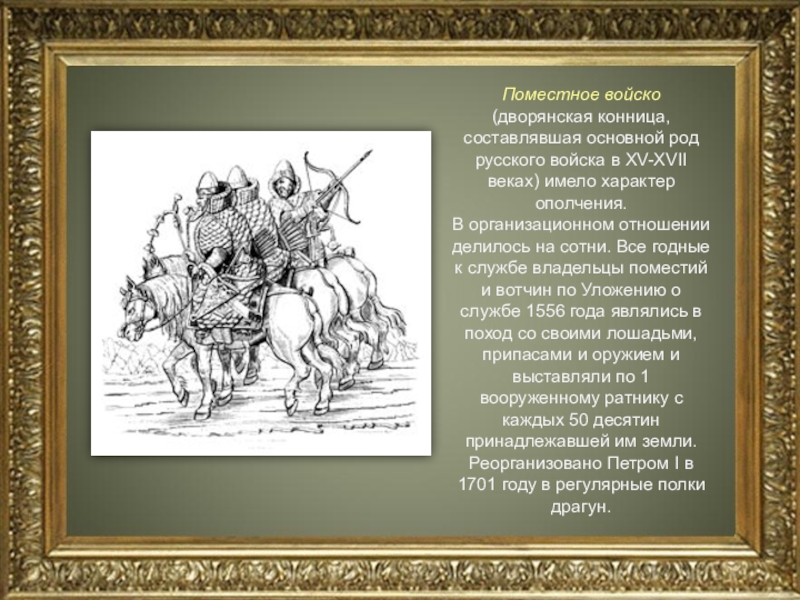 Слайд 12Поместное войско (дворянская конница, составлявшая основной род русского войска в XV-XVII