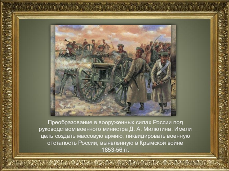 Милютина. Имели цель создать массовую армию, ликвидировать военную отсталость России, выявленную в Крымской войне 1853-56 гг.