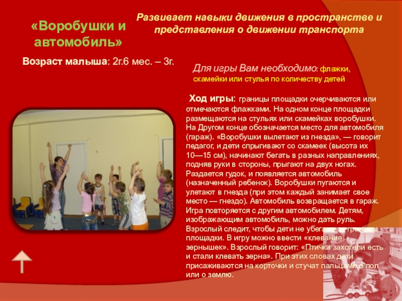 Ход игры: границы площадки очерчиваются или отмечаются флажками. На одном конце площадки размещаются на стульях или скамейках воробушки. На Другом конце обозначается место для автомобиля (гараж). «Воробушки вылетают из гнезда», — говорит педагог, и дети спрыгивают со скамеек (высота их 10—15 см), начинают бегать в разных направлениях, подняв руки в стороны, прыгают на двух ногах. Раздается гудок, и появляется автомобиль (назначенный ребенок). Воробушки пугаются и улетают в гнезда (при этом каждый занимает свое место — гнездо). Автомобиль возвращается в гараж. Игра повторяется с другим автомобилем. Детям, изображающим автомобиль, можно дать руль. Взрослый следит, чтобы дети не убегали за границы площадки. В игру можно ввести «клевание зернышек». Взрослый говорит: «Птички захотели есть и стали клевать зерна». При этих словах дети присаживаются на корточки и стучат пальцами о пол или о землю.