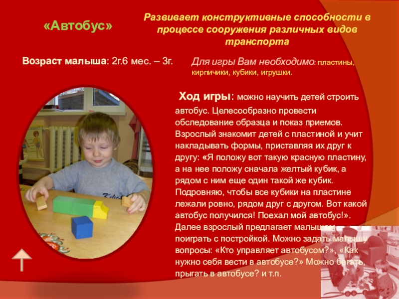 Ход игры: можно научить детей строить автобус. Целесообразно провести обследование образца и показ приемов. Взрослый знакомит детей с пластиной и учит накладывать формы, приставляя их друг к другу: «Я положу вот такую красную пластину, а на нее положу сначала желтый кубик, а рядом с ним еще один такой же кубик. Подровняю, чтобы все кубики на пластине лежали ровно, рядом друг с другом. Вот какой автобус получился! Поехал мой автобус!». Далее взрослый предлагает малышам поиграть с постройкой. Можно задать малышу вопросы: «Кто управляет автобусом?», «Как нужно себя вести в автобусе?» Можно бегать, прыгать в автобусе? и т.п.
