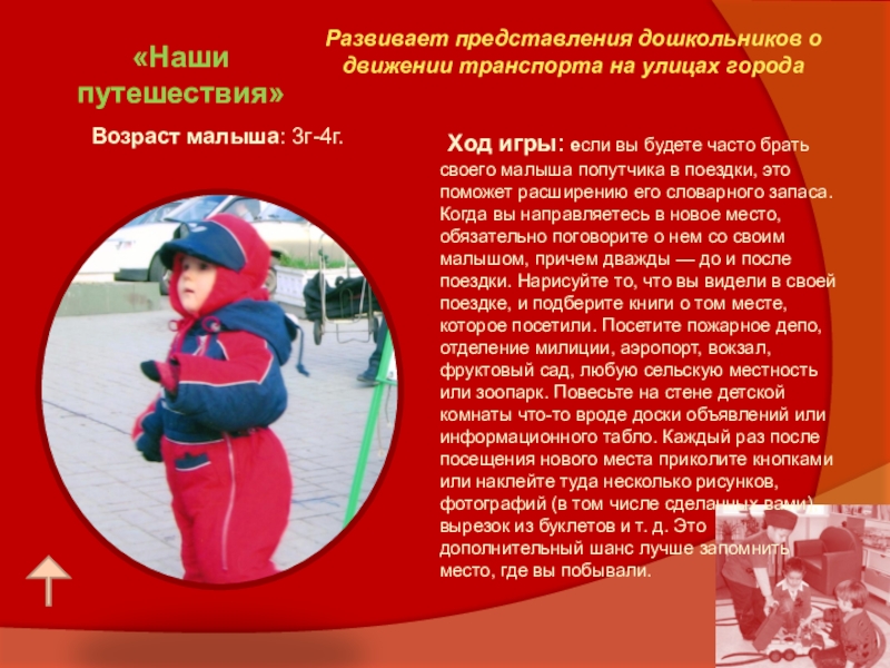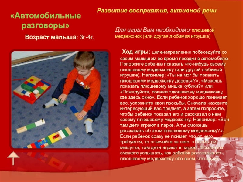 Ход игры: целенаправленно побеседуйте со своим малышом во время поездки в автомобиле. Попросите ребенка показать что-нибудь своему плюшевому медвежонку (или другой любимой игрушке). Например: «Ты не мог бы показать плюшевому медвежонку деревья?», «Можешь показать плюшевому мишке кубики?» или «Пожалуйста, покажи плюшевому медвежонку, где здесь окно». Если ребенок хорошо понимает вас, усложните свои просьбы. Сначала назовите интересующий вас предмет, а затем попросите, чтобы ребенок показал его и рассказал о нем своему плюшевому медвежонку. Например: «Вон там дети играют в парке. А ты сможешь рассказать об этом плюшевому медвежонку?». Если ребенок сразу не поймет, что от него требуется, то отвечайте за него: «Посмотри, мишутка, там дети играют в парке». Вскоре вы сможете услышать, как ребенок рассказывает плюшевому медвежонку обо всем, что видит.