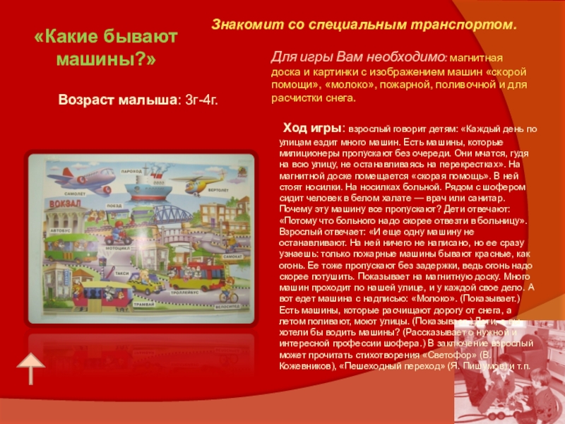 Ход игры: взрослый говорит детям: «Каждый день по улицам ездит много машин. Есть машины, которые милиционеры пропускают без очереди. Они мчатся, гудя на всю улицу, не останавливаясь на перекрестках». На магнитной доске помещается «скорая помощь». В ней стоят носилки. На носилках больной. Рядом с шофером сидит человек в белом халате — врач или санитар. Почему эту машину все пропускают? Дети отвечают: «Потому что больного надо скорее отвезти в больницу». Взрослый отвечает: «И еще одну машину не останавливают. На ней ничего не написано, но ее сразу узнаешь: только пожарные машины бывают красные, как огонь. Ее тоже пропускают без задержки, ведь огонь надо скорее потушить. Показывает на магнитную доску. Много машин проходит по нашей улице, и у каждой свое дело. А вот едет машина с надписью: «Молоко». (Показывает.) Есть машины, которые расчищают дорогу от снега, а летом поливают, моют улицы. (Показывает.) Дети, а вы хотели бы водить машины? (Рассказывает о нужной и интересной профессии шофера.) В заключение взрослый может прочитать стихотворения «Светофор» (В. Кожевников), «Пешеходный переход» (Я. Пишумов) и т.п.