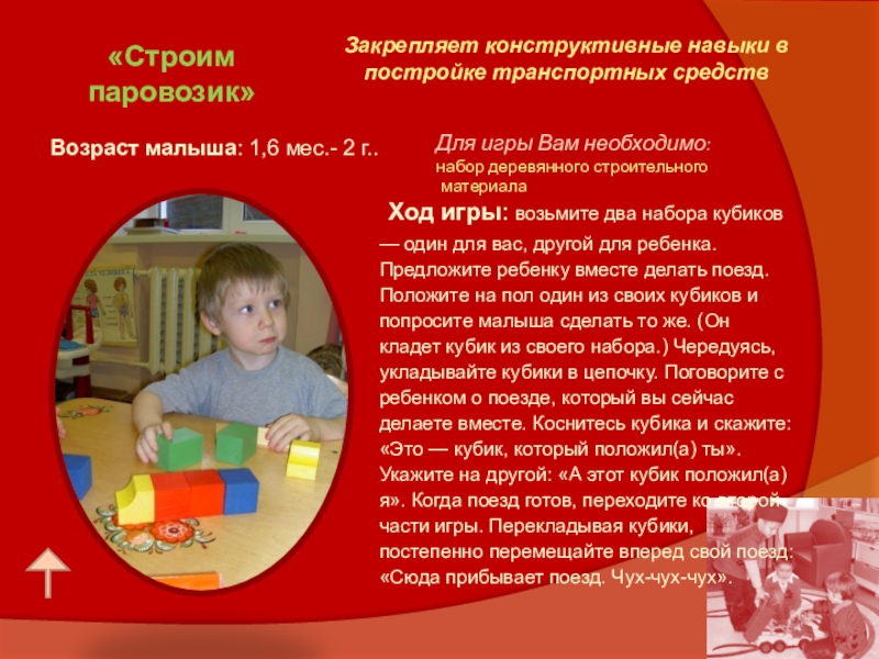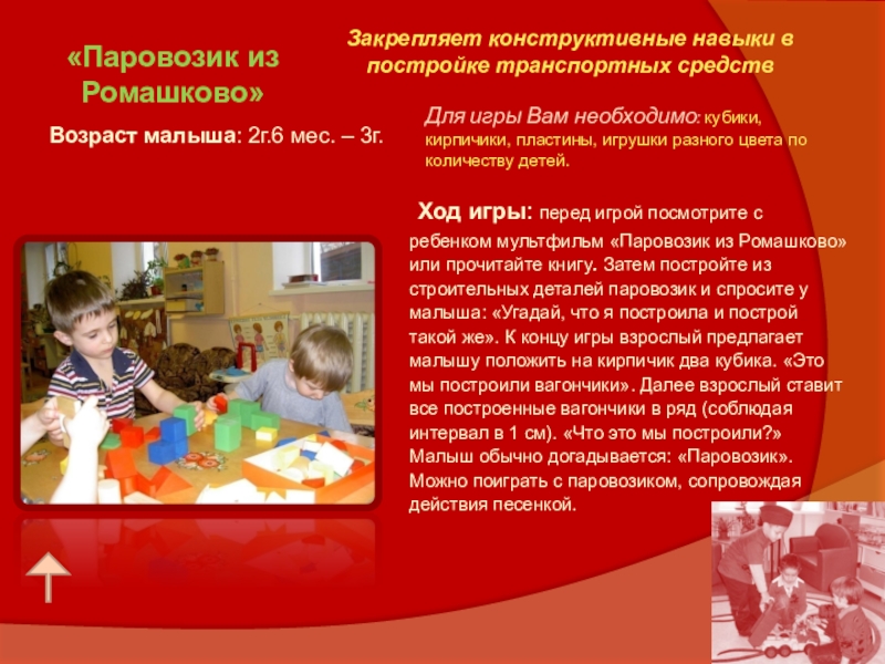 Ход игры: перед игрой посмотрите с ребенком мультфильм «Паровозик из Ромашково» или прочитайте книгу. Затем постройте из строительных деталей паровозик и спросите у малыша: «Угадай, что я построила и построй такой же». К концу игры взрослый предлагает малышу положить на кирпичик два кубика. «Это мы построили вагончики». Далее взрослый ставит все построенные вагончики в ряд (соблюдая интервал в 1 см). «Что это мы построили?» Малыш обычно догадывается: «Паровозик». Можно поиграть с паровозиком, сопровождая действия песенкой.