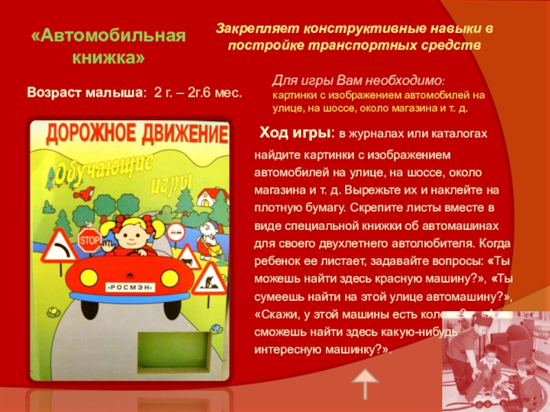 Ход игры: в журналах или каталогах найдите картинки с изображением автомобилей на улице, на шоссе, около магазина и т. д. Вырежьте их и наклейте на плотную бумагу. Скрепите листы вместе в виде специальной книжки об автомашинах для своего двухлетнего автолюбителя. Когда ребенок ее листает, задавайте вопросы: «Ты можешь найти здесь красную машину?», «Ты сумеешь найти на этой улице автомашину?», «Скажи, у этой машины есть колеса?», «А ты сможешь найти здесь какую-нибудь интересную машинку?».