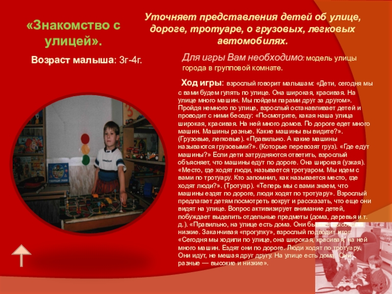Ход игры: взрослый говорит малышам: «Дети, сегодня мы с вами будем гулять по улице. Она широкая, красивая. На улице много машин. Мы пойдем парами друг за другом». Пройдя немного по улице, взрослый останавливает детей и проводит с ними беседу: «Посмотрите, какая наша улица широкая, красивая. На ней много домов. По дороге едет много машин. Машины разные. Какие машины вы видите?». (Грузовые, легковые). «Правильно. А какие машины называются грузовыми?». (Которые перевозят груз). «Где едут машины?» Если дети затрудняются ответить, взрослый объясняет, что машины едут по дороге. Она широкая (узкая). «Место, где ходят люди, называется тротуаром. Мы идем с вами по тротуару. Кто запомнил, как называется место, где ходят люди?». (Тротуар). «Теперь мы с вами знаем, что машины ездят по дороге, люди ходят по тротуару». Взрослый предлагает детям посмотреть вокруг и рассказать, что еще они видят на улице. Вопрос активизирует внимание детей, побуждает выделить отдельные предметы (дома, деревья и т. д.). «Правильно, на улице есть дома. Они бывают высокие и низкие. Заканчивая «прогулку», взрослый подводит итог: «Сегодня мы ходили по улице, она широкая, красивая, на ней много машин. Ездят они по дороге. Люди ходят по тротуару. Они идут, не мешая друг другу. На улице есть дома. Они разные — высокие и низкие».