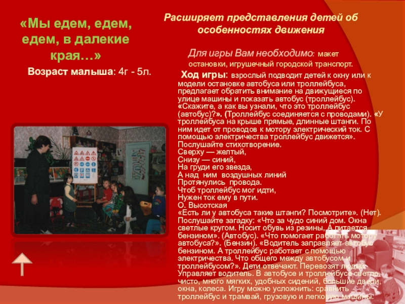 Ход игры: взрослый подводит детей к окну или к модели остановке автобуса или троллейбуса, предлагает обратить внимание на движущиеся по улице машины и показать автобус (троллейбус). «Скажите, а как вы узнали, что это троллейбус (автобус)?». (Троллейбус соединяется с проводами). «У троллейбуса на крыше прямые, длинные штанги. По ним идет от проводов к мотору электрический ток. С помощью электричества троллейбус движется». Послушайте стихотворение.