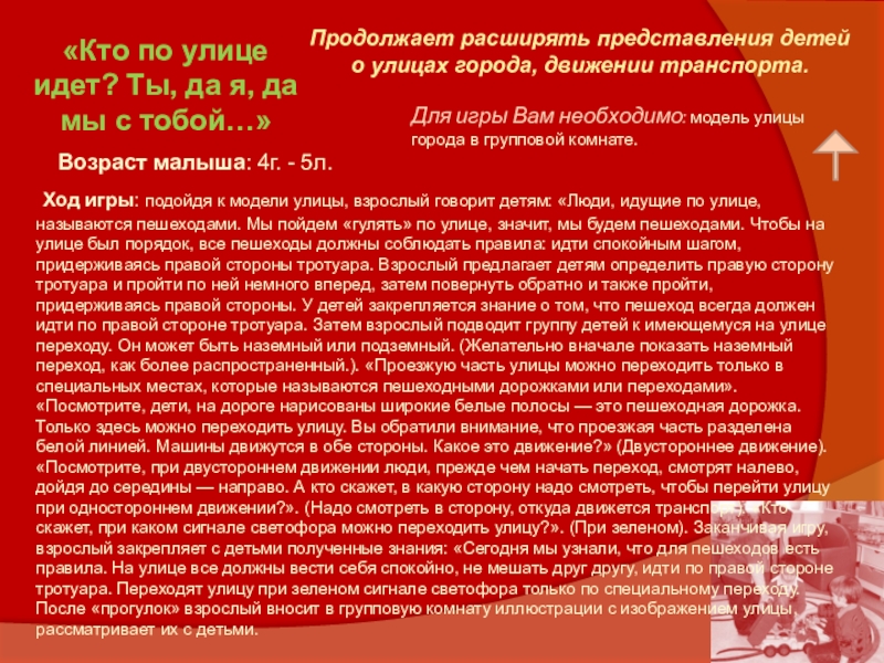 Ход игры: подойдя к модели улицы, взрослый говорит детям: «Люди, идущие по улице, называются пешеходами. Мы пойдем «гулять» по улице, значит, мы будем пешеходами. Чтобы на улице был порядок, все пешеходы должны соблюдать правила: идти спокойным шагом, придерживаясь правой стороны тротуара. Взрослый предлагает детям определить правую сторону тротуара и пройти по ней немного вперед, затем повернуть обратно и также пройти, придерживаясь правой стороны. У детей закрепляется знание о том, что пешеход всегда должен идти по правой стороне тротуара. Затем взрослый подводит группу детей к имеющемуся на улице переходу. Он может быть наземный или подземный. (Желательно вначале показать наземный переход, как более распространенный.). «Проезжую часть улицы можно переходить только в специальных местах, которые называются пешеходными дорожками или переходами». «Посмотрите, дети, на дороге нарисованы широкие белые полосы — это пешеходная дорожка. Только здесь можно переходить улицу. Вы обратили внимание, что проезжая часть разделена белой линией. Машины движутся в обе стороны. Какое это движение?» (Двустороннее движение). «Посмотрите, при двустороннем движении люди, прежде чем начать переход, смотрят налево, дойдя до середины — направо. А кто скажет, в какую сторону надо смотреть, чтобы перейти улицу при одностороннем движении?». (Надо смотреть в сторону, откуда движется транспорт). «Кто скажет, при каком сигнале светофора можно переходить улицу?». (При зеленом). Заканчивая игру, взрослый закрепляет с детьми полученные знания: «Сегодня мы узнали, что для пешеходов есть правила. На улице все должны вести себя спокойно, не мешать друг другу, идти по правой стороне тротуара. Переходят улицу при зеленом сигнале светофора только по специальному переходу. После «прогулок» взрослый вносит в групповую комнату иллюстрации с изображением улицы, рассматривает их с детьми.