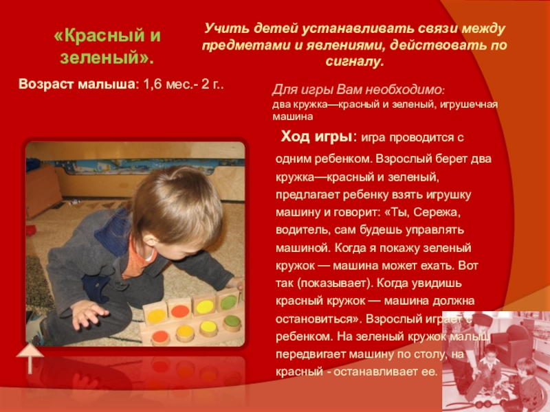 Ход игры: игра проводится с одним ребенком. Взрослый берет два кружка—красный и зеленый, предлагает ребенку взять игрушку машину и говорит: «Ты, Сережа, водитель, сам будешь управлять машиной. Когда я покажу зеленый кружок — машина может ехать. Вот так (показывает). Когда увидишь красный кружок — машина должна остановиться». Взрослый играет с ребенком. На зеленый кружок малыш передвигает машину по столу, на красный - останавливает ее.