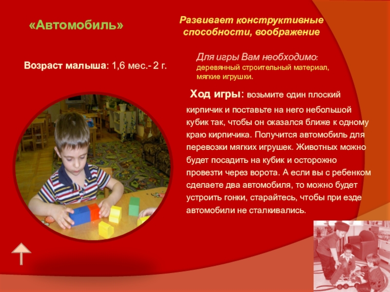 Ход игры: возьмите один плоский кирпичик и поставьте на него небольшой кубик так, чтобы он оказался ближе к одному краю кирпичика. Получится автомобиль для перевозки мягких игрушек. Животных можно будет посадить на кубик и осторожно провезти через ворота. А если вы с ребенком сделаете два автомобиля, то можно будет устроить гонки, старайтесь, чтобы при езде автомобили не сталкивались.