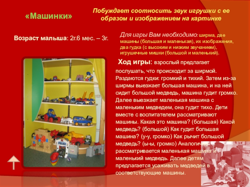 Ход игры: взрослый предлагает послушать, что происходит за ширмой. Раздаются гудки: громкий и тихий. Затем из-за ширмы выезжает большая машина, и на ней сидит большой медведь, машина гудит громко. Далее выезжает маленькая машина с маленьким медведем, она гудит тихо. Дети вместе с воспитателем рассматривают машины. Какая это машина? (большая) Какой медведь? (большой) Как гудит большая машина? (у-у, громко) Как рычит большой медведь? (ы-ы, громко) Аналогично рассматривается маленькая машина и маленький медведь. Далее детям предлагается усаживать медведей в соответствующие машины.