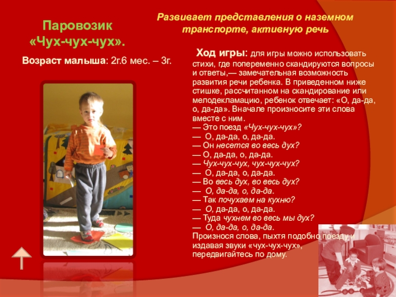 Ход игры: попросите, ребенка развести ручки в стороны. Покажите ему, как бегать по комнате самолетиком, издавая тук «Ж-ж-ж-ж-ж». Потом скажите: «А теперь пришло время заходить на посадку и приземляться». Покажите малышу, как замедлять движения и, наконец, окончательно остановиться.