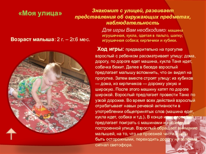 Ход игры: предварительно на прогулке взрослый с ребенком рассматривает улицу: дома, дорогу, по дороге едет машина, кукла Таня идет, собачка бежит. Далее в беседе взрослый предлагает малышу вспомнить, что он видел на прогулке. Затем вместе строят улицу: из кубиков — дома, из кирпичиков — дорожку узкую и широкую. После этого машину катят по дороге широкой. Взрослый предлагает провести Таню по узкой дорожке. Во время всех действий взрослый отрабатывает навык речевой активности в употреблении общепринятых слов (машина едет, кукла идет, собака и т.д.). В конце игры взрослый предлагает поиграть с машинами и куклами на построенной улице. Взрослый обращает внимание малышей, на то, что на проезжей части нужно быть осторожными, переходить дорогу на зеленый сигнал светофора.