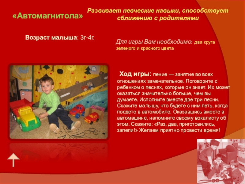 Ход игры: пение — занятие во всех отношениях замечательное. Поговорите с ребенком о песнях, которые он знает. Их может оказаться значительно больше, чем вы думаете. Исполните вместе две-три песни. Скажите малышу, что будете с ним петь, когда поедете в автомобиле. Оказавшись вместе в автомашине, напомните своему вокалисту об этом. Скажите: «Раз, два, приготовились, запели!» Желаем приятно провести время!