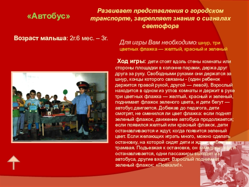 Ход игры: дети стоят вдоль стены комнаты или стороны площадки в колонне парами, держа друг друга за руку. Свободными руками они держатся за шнур, концы которого связаны - (один ребенок держится правой рукой, другой — левой). Взрослый находится в одном из углов комнаты и держит в руке три цветных флажка — желтый, красный и зеленый, поднимает флажок зеленого цвета, и дети бегут — автобус двигается. Добежав до педагога, дети смотрят, не сменился ли цвет флажка: если поднят зеленый флажок, движение автобуса продолжается; если появился желтый или красный флажок, дети останавливаются и ждут, когда появится зеленый цвет. Если желающих играть много, можно сделать остановку, на которой сидят дети и ждут прибытия трамвая. Подъезжая к остановке, он замедляет ход и останавливается, одни пассажиры выходят из автобуса, другие входят. Взрослый поднимает зеленый флажок: «Поехали!».