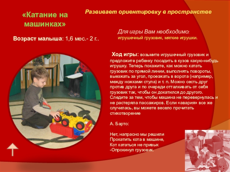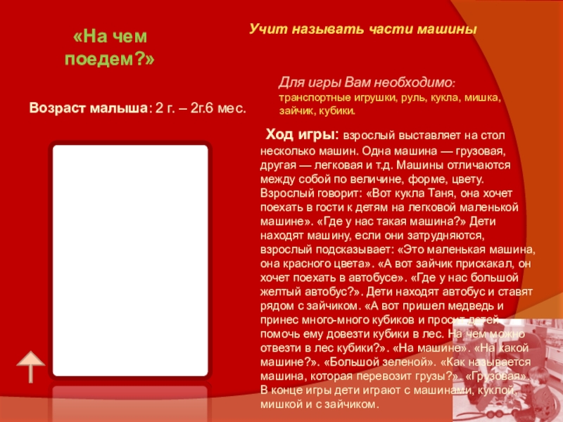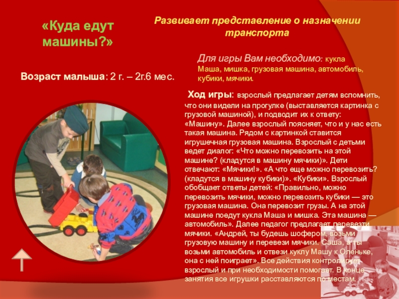 Ход игры: взрослый предлагает детям вспомнить, что они видели на прогулке (выставляется картинка с грузовой машиной), и подводит их к ответу: «Машину». Далее взрослый поясняет, что и у нас есть такая машина. Рядом с картинкой ставится игрушечная грузовая машина. Взрослый с детьми ведет диалог: «Что можно перевозить на этой машине? (кладутся в машину мячики)». Дети отвечают: «Мячики!». «А что еще можно перевозить? (кладутся в машину кубики)». «Кубики». Взрослый обобщает ответы детей: «Правильно, можно перевозить мячики, можно перевозить кубики — это грузовая машина. Она перевозит грузы. А на этой машине поедут кукла Маша и мишка. Эта машина — автомобиль». Далее педагог предлагает перевезти мячики. «Андрей, ты будешь шофером, возьми грузовую машину и перевези мячики. Саша, а ты возьми автомобиль и отвези куклу Машу к Оленьке, она с ней поиграет». Все действия контролирует взрослый и при необходимости помогает. В конце занятия все игрушки расставляются по местам.