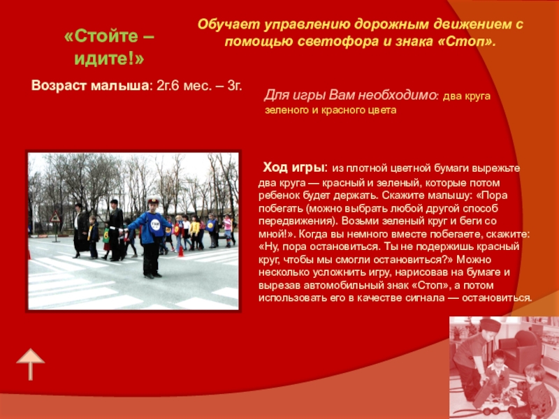 Ход игры: из плотной цветной бумаги вырежьте два круга — красный и зеленый, которые потом ребенок будет держать. Скажите малышу: «Пора побегать (можно выбрать любой другой способ передвижения). Возьми зеленый круг и беги со мной!». Когда вы немного вместе побегаете, скажите: «Ну, пора остановиться. Ты не подержишь красный круг, чтобы мы смогли остановиться?» Можно несколько усложнить игру, нарисовав на бумаге и вырезав автомобильный знак «Стоп», а потом использовать его в качестве сигнала — остановиться.