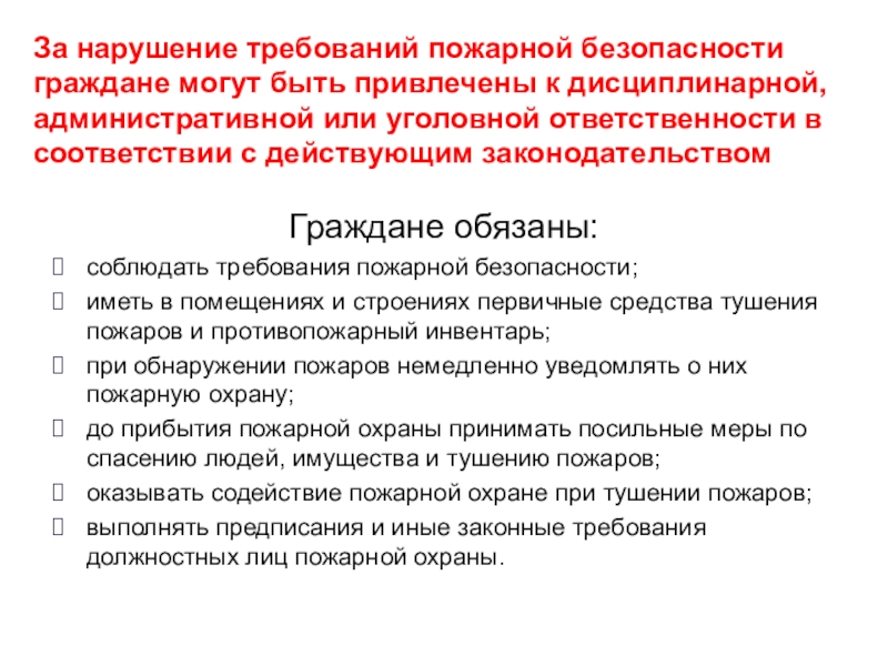 За нарушение требований пожарной безопасности граждане могут быть привлечены к дисциплинарной, административной или уголовной ответственности в соответствии с действующим законодательством