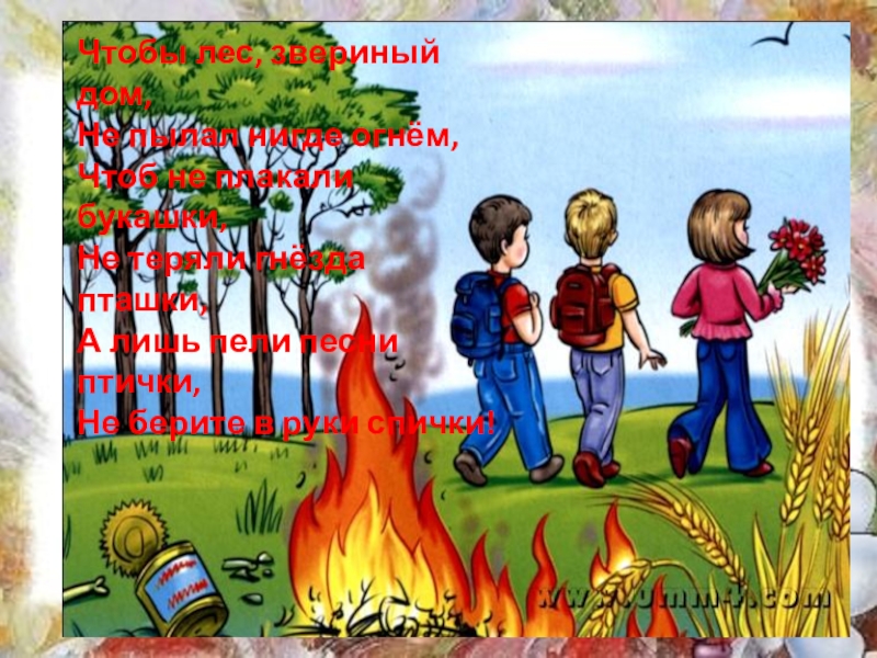 Чтобы лес, звериный дом, Не пылал нигде огнём, Чтоб не плакали букашки, Не теряли гнёзда пташки, А лишь пели песни птички, Не берите в руки спички!