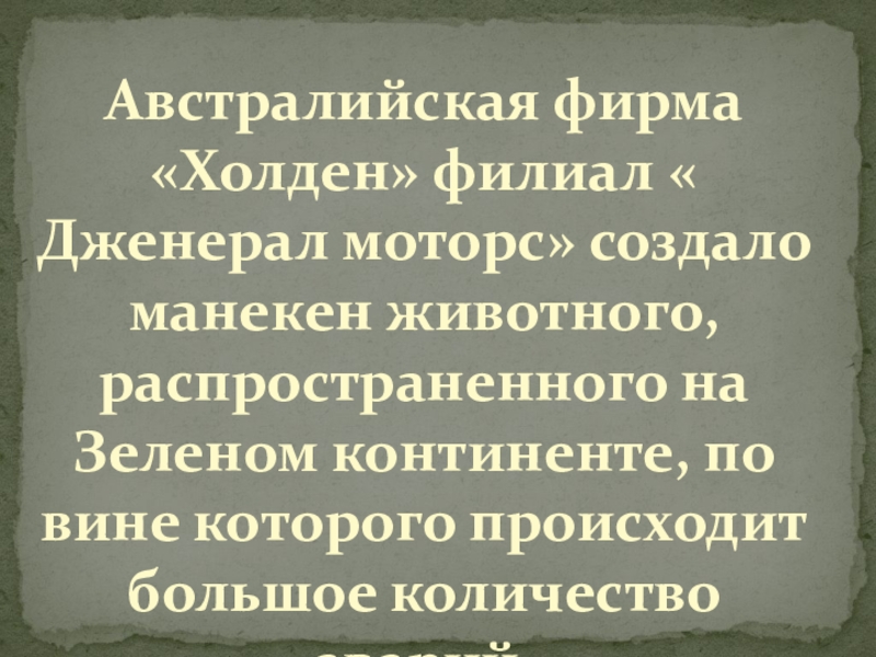 Слайд 16Австралийская фирма «Холден» филиал « Дженерал моторс» создало манекен животного, распространенного
