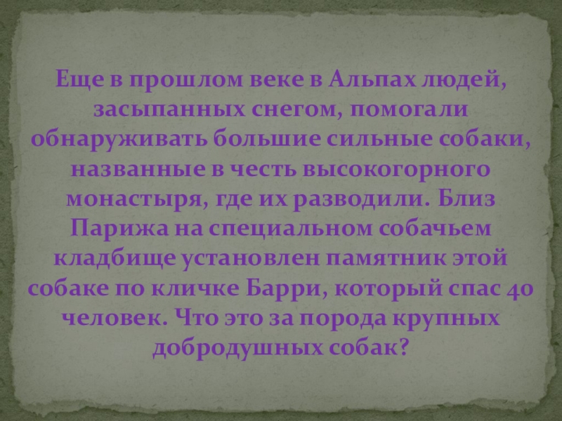 большие сильные собаки, названные в честь высокогорного монастыря, где их разводили. Близ Парижа на специальном собачьем кладбище установлен памятник этой собаке по кличке Барри, который спас 40 человек. Что это за порода крупных добродушных собак?