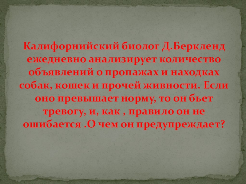 Слайд 49Калифорнийский биолог Д.Беркленд ежедневно анализирует количество объявлений о пропажах и находках