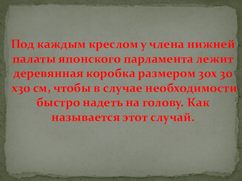 Слайд 46Под каждым креслом у члена нижней палаты японского парламента лежит деревянная