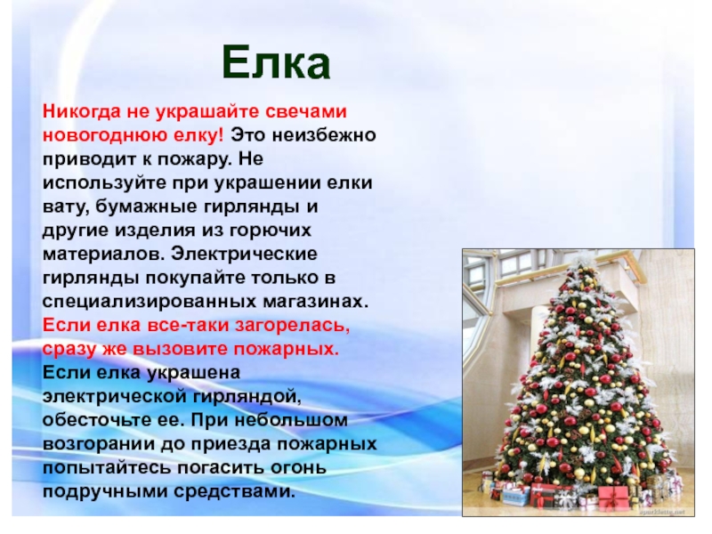 ЕлкаНикогда не украшайте свечами новогоднюю елку! Это неизбежно приводит к пожару. Не используйте при украшении елки вату, бумажные гирлянды и другие изделия из горючих материалов. Электрические гирлянды покупайте только в специализированных магазинах.Если елка все-таки загорелась, сразу