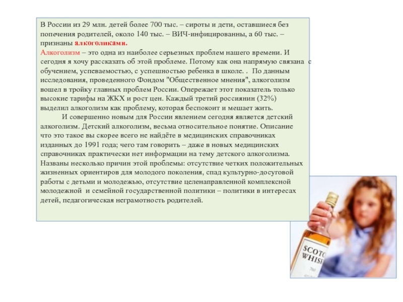 Алкоголизм – это одна из наиболее серьезных проблем нашего времени. И сегодня я хочу рассказать об этой проблеме. Потому как она напрямую связана с обучением, успеваемостью, с успешностью ребенка в школе. . По данным исследования, проведенного Фондом "Общественное мнения", алкоголизм вошел в тройку главных проблем России. Опережает этот показатель только высокие тарифы на ЖКХ и рост цен. Каждый третий россиянин (32%) выделил алкоголизм как проблему, которая беспокоит и мешает жить.