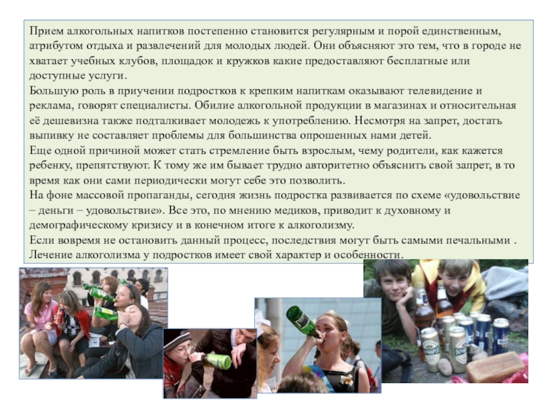 Слайд 9Прием алкогольных напитков постепенно становится регулярным и порой единственным, атрибутом отдыха