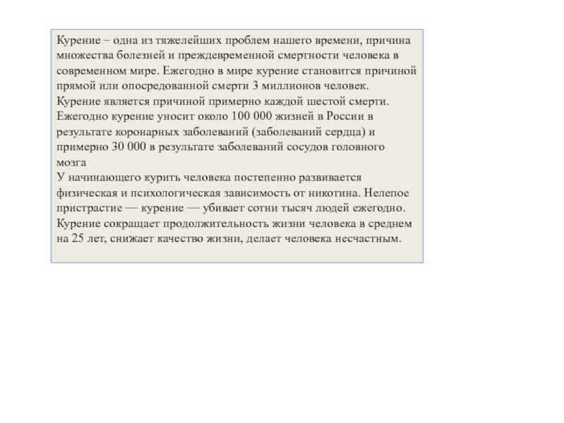 У начинающего курить человека постепенно развивается физическая и психологическая зависимость от никотина. Нелепое пристрастие — курение — убивает сотни тысяч людей ежегодно. Курение сокращает продолжительность жизни человека в среднем на 25 лет, снижает качество жизни, делает человека несчастным.