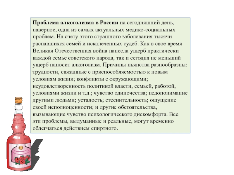 медико-социальных проблем. На счету этого страшного заболевания тысячи распавшихся семей и искалеченных судеб. Как в свое время Великая Отечественная война нанесла ущерб практически каждой семье советского народа, так и сегодня не меньший ущерб наносит алкоголизм. Причины пьянства разнообразны: трудности, связанные с приспособляемостью к новым условиям жизни; конфликты с окружающими; неудовлетворенность политикой власти, семьей, работой, условиями жизни и т.д.; чувство одиночества; недопонимание другими людьми; усталость; стеснительность; ощущение своей неполноценности; и другие обстоятельства, вызывающие чувство психологического дискомфорта. Все эти проблемы, выдуманные и реальные, могут временно облегчаться действием спиртного.