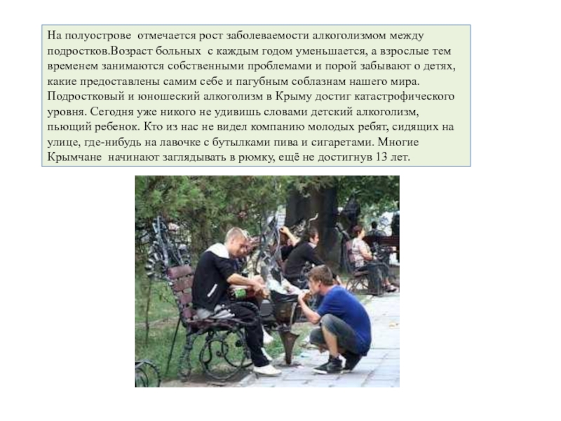 Слайд 8На полуострове отмечается рост заболеваемости алкоголизмом между подростков.Возраст больных с каждым
