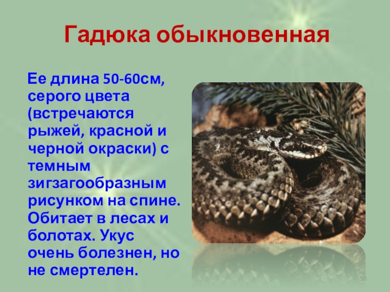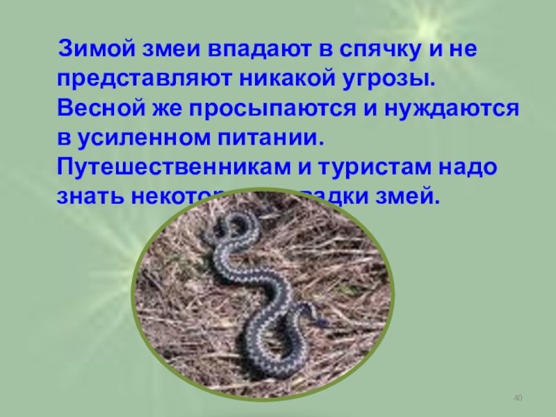 Слайд 40 Зимой змеи впадают в спячку и не представляют никакой