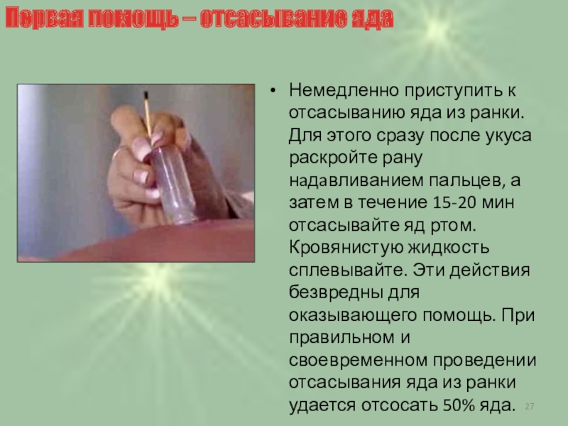 Слайд 27Немедленно приступить к отсасыванию яда из ранки. Для этого сразу после