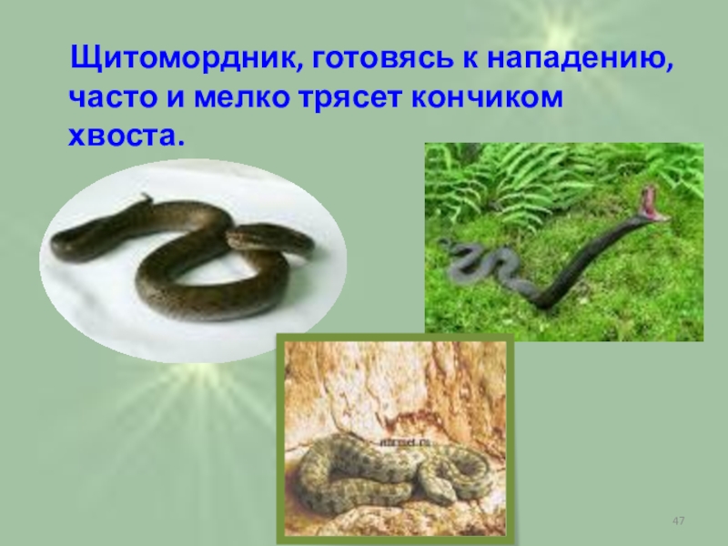 Слайд 47 Щитомордник, готовясь к нападению, часто и мелко трясет кончиком