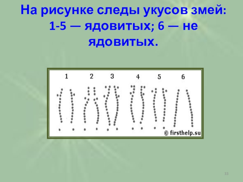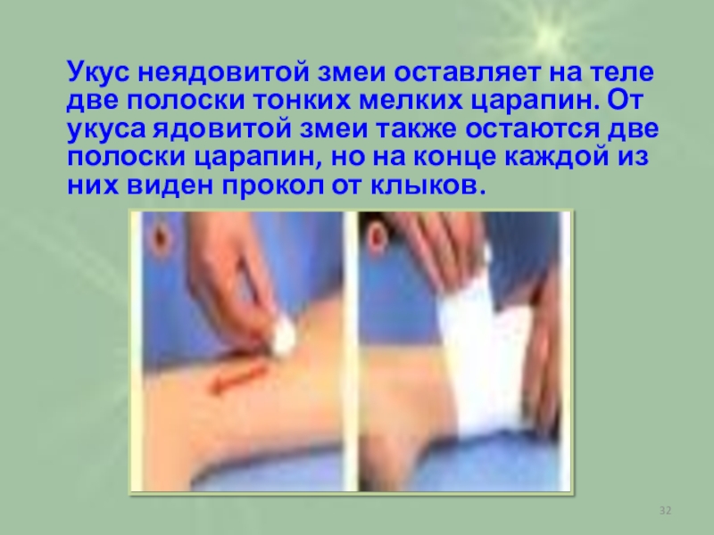 Слайд 32 Укус неядовитой змеи оставляет на теле две полоски тонких