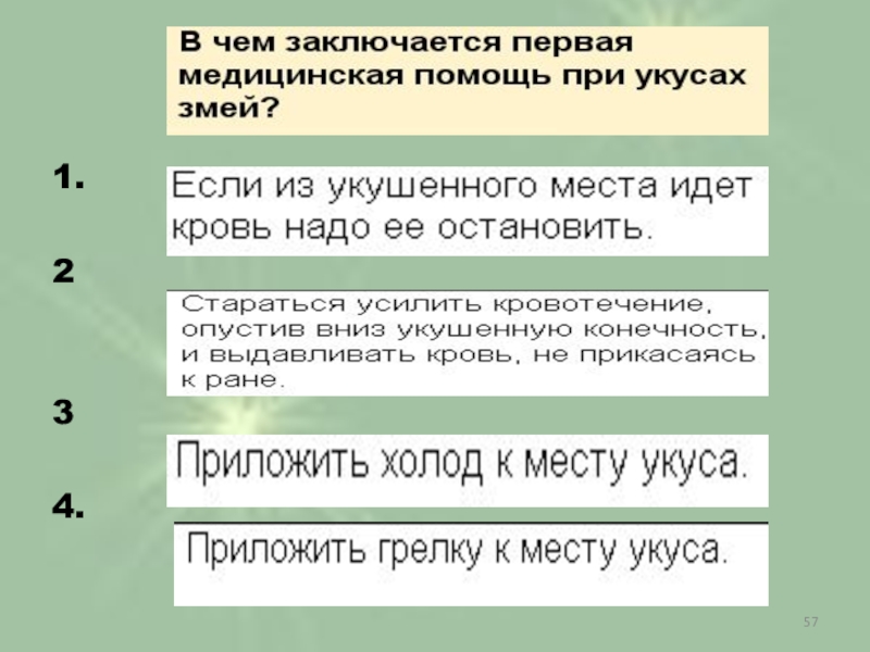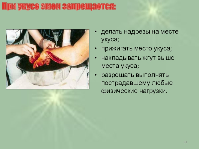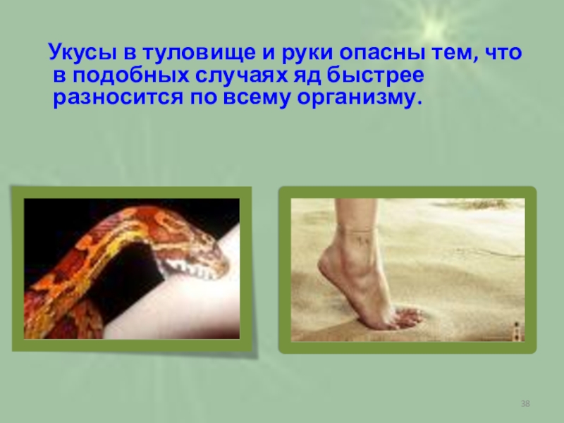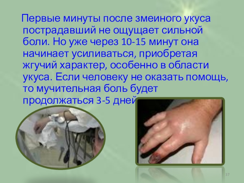 Слайд 37 Первые минуты после змеиного укуса пострадавший не ощущает сильной