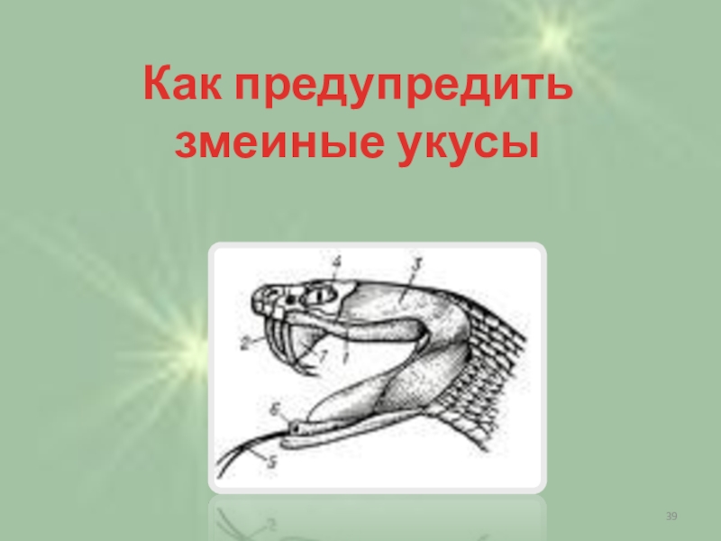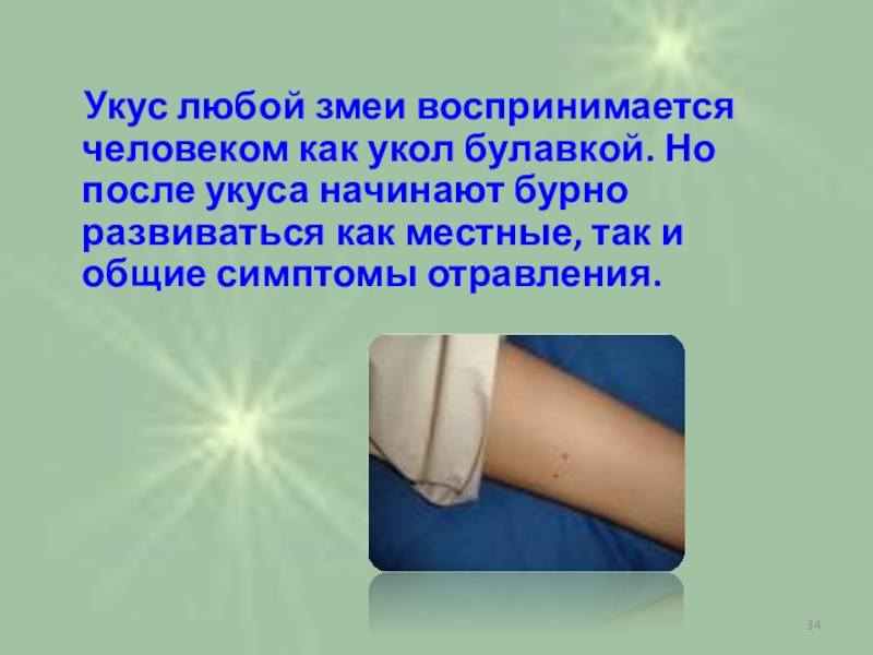 Слайд 34 Укус любой змеи воспринимается человеком как укол булавкой. Но