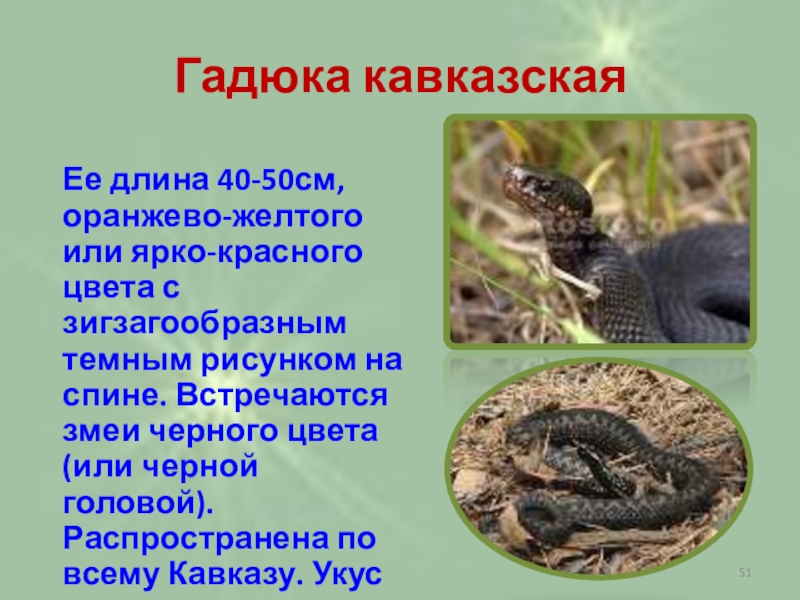 зигзагообразным темным рисунком на спине. Встречаются змеи черного цвета (или черной головой). Распространена по всему Кавказу. Укус опасен для жизни.