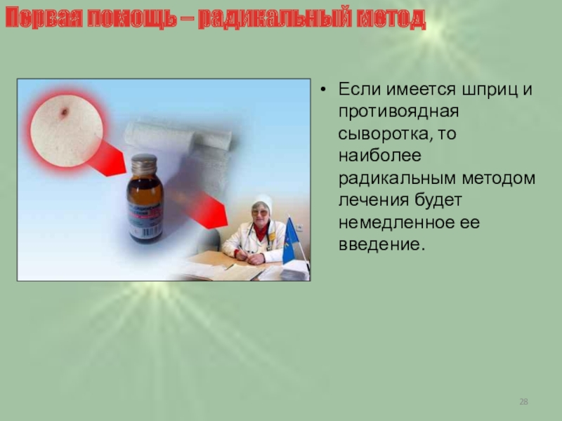 Слайд 28Если имеется шприц и противоядная сыворотка, то наиболее радикальным методом лечения