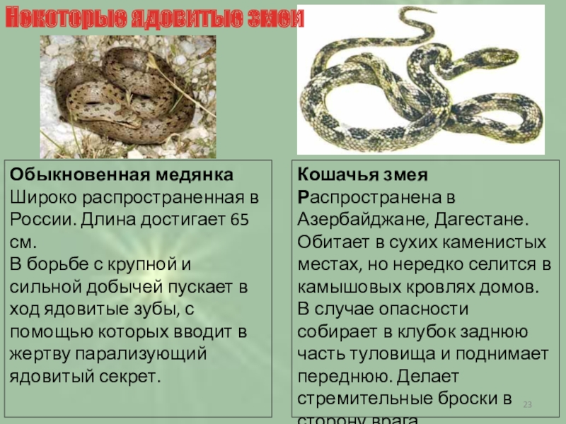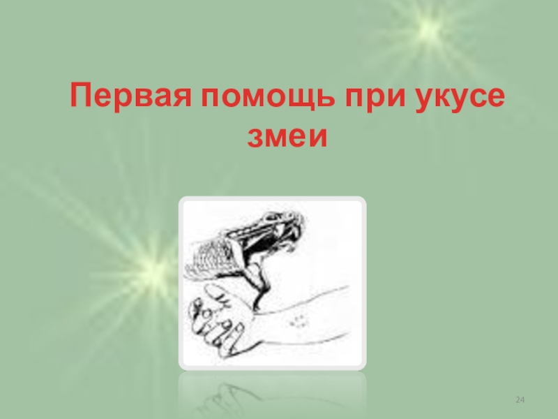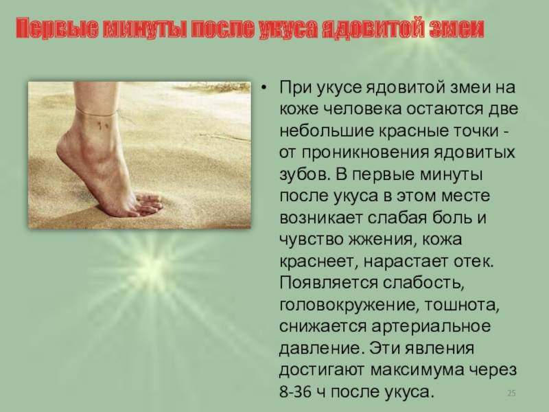Слайд 25При укусе ядовитой змеи на коже человека остаются две небольшие красные