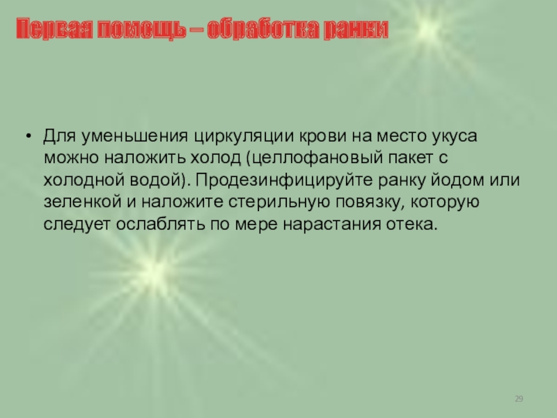 Слайд 29Для уменьшения циркуляции крови на место укуса можно наложить холод (целлофановый